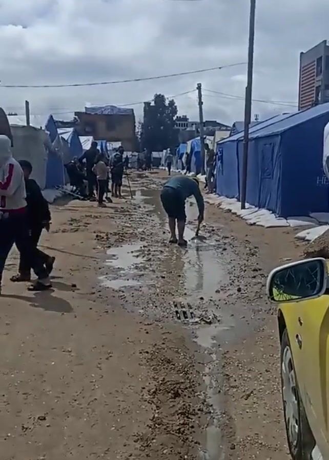 street in a camp of blue tents, possibly a refugee or displaced persons camp. The unpaved road is muddy and full of puddles. People are walking along the street, including children. One man is using a shovel to dig in a puddle. A yellow car is parked on the side of the road, with the side mirror visible in the right foreground of the video. The sky is overcast. The scene suggests a difficult living situation with limited infrastructure.