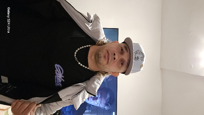 This image captures a male individual indoors within a building located in Real Sitio de San Ildefonso, Spain. The subject is a male of apparent middle age, possessing light skin, facial stubble, and tightly curled, light-colored hair styled as a mullet, visible extending from beneath his headwear. He is wearing a light gray baseball cap with a dark gray brim, featuring an ornate letter "G" embroidery and a small gold-colored pin. Around his neck is a silver-colored chain necklace with oval links. He wears a black t-shirt adorned with a purple-blue graphic design on the left chest area, and an open light gray and dark gray/black puffer jacket. His hands are positioned to hold the front edges of the open jacket. He gazes directly at the viewer with a neutral facial expression. The background features a plain, light-colored wall and ceiling. Behind the individual, to his right (viewer's left), a television screen is visible, displaying a scene that includes a male figure with a distinct blueish glow illuminating his face.