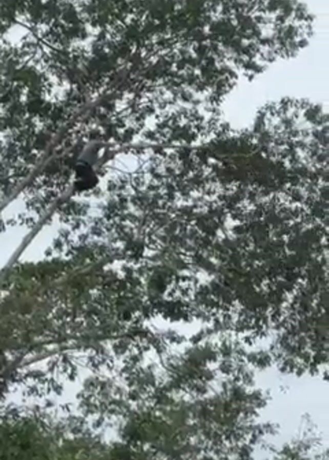 A person is seen perched high in a leafy tree, sawing at a branch. The tree's leaves are dense and predominantly green. The sky appears overcast. A lower level of greenery can be seen beneath the tree. The individual sawing is wearing dark clothing. The loud sound of a motor is also evident.