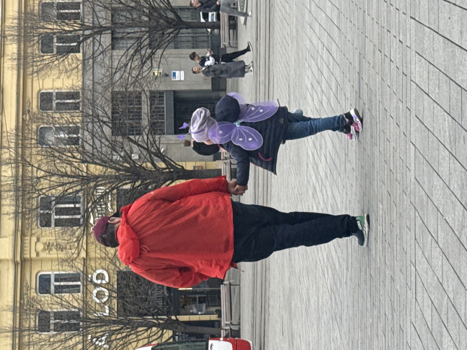 An outdoor scene in Náměstí Svobody, Brno, Czechia, shows an adult male and a young child walking away from the camera. The adult, viewed from behind, wears a red hooded jacket, dark trousers, a maroon baseball cap, and black HOKA sneakers with green accents. His left hand grasps the child's right hand. The child, also viewed from behind, wears a dark blue puffer jacket, blue jeans, a light grey knitted hat adorned with purple butterfly antennae, and sheer purple butterfly wings attached to their back; they wear pink and black sneakers. Both individuals are walking on a light grey paved surface composed of rectangular tiles. In the background, a prominent yellow multi-story building with multiple windows is visible, displaying the white letters "NALOD" and a partial "Starobrno" sign on its facade. Leafless trees with dark branches are distributed across the square. Other pedestrians are visible in the mid-ground, along with several wooden benches. A red and white tram is partially visible on the far left edge of the image. The scene is illuminated by ambient daylight, consistent with an overcast sky.