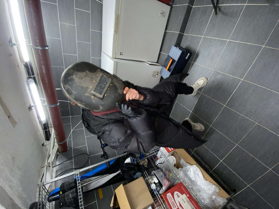 A person wearing a welding mask and a black puffer jacket stands in a room with gray tiled floors and walls. Fluorescent lights run vertically along one wall next to a red pipe. Behind the person are two stacked white freezers and a blue toolbox. Below the person is a metal shelving unit filled with various items, including boxes and plastic wrap. The person wears gloves and sneakers.