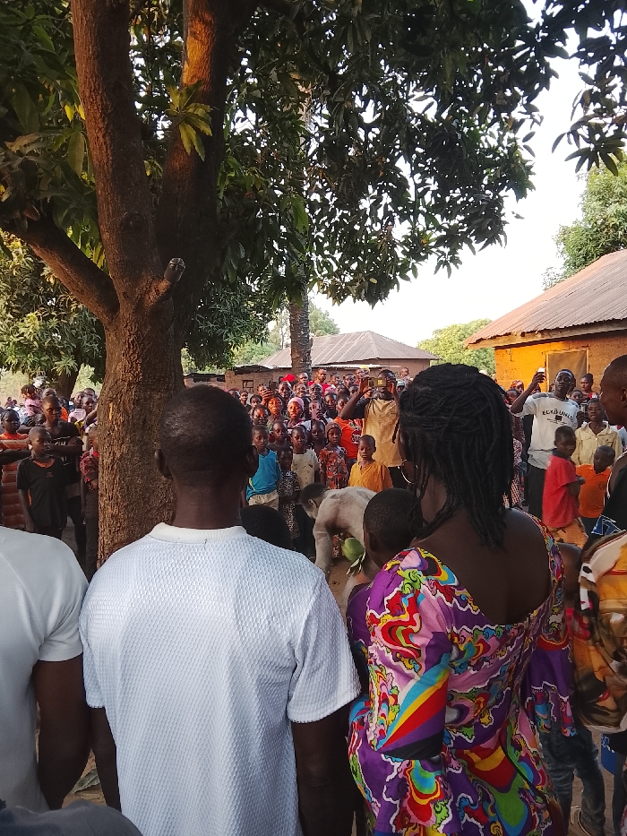 The image captures an outdoor gathering in Tabu, Nigeria, under daylight conditions, likely late afternoon