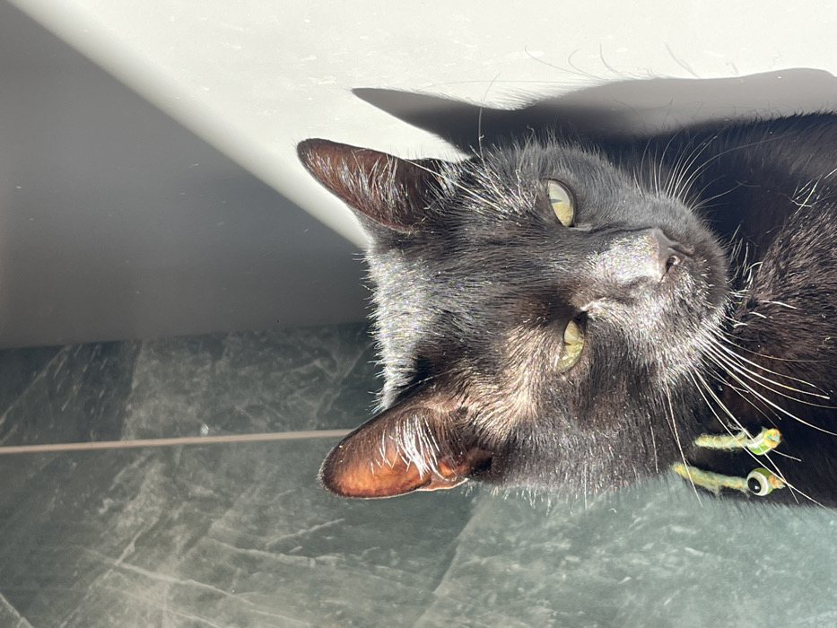 A black cat is depicted in a close-up, head-and-shoulders view, illuminated by strong natural light in an indoor setting within Paiporta, Spain