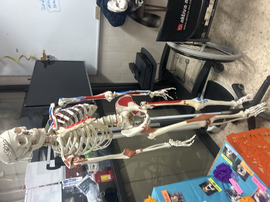 The scene depicts an interior view of a facility located in the city of Interlomas, Mexico. A full-size anatomical skeleton model, constructed from white plastic with red, blue, and brown muscle and ligament markings, stands prominently on a wheeled base in the midground, facing right. A small silver-colored tiara adorns the skull of the model. To the left of the skeleton, a multi-tiered display stand, covered in blue and orange paper, is partially visible. This stand features multiple photographs of dogs, labeled with names such as "Mica," "Zilome," and "Brenda," accompanied by purple and orange decorative pom-poms, consistent with an 'Ofrenda' (altar) for Day of the Dead. Behind the display, a clear barrier reveals various items including a red biohazard sharps container. In the background, a dark flat-screen monitor is wall-mounted. To its right, a white dry-erase board displays handwritten blue text, partially legible, including "Pediatría," "Octubre," and "Patolog." A yellow paper streamer hangs from the top right of the monitor, and a paper cutout of a skull wearing a sombrero is affixed to the whiteboard. The walls are tiled white with horizontal grout lines. To the right of the skeleton, a black rolling medical or utility cart supports a black electronic device (possibly a game console or medical equipment) on its top shelf, with another smaller black object resting on it. Below the shelf, a metallic platform scale is positioned on the floor. Adjacent to the cart on the right, a black wheelchair with the branding "aktiva-mx.com" is parked, its backrest draped with a dark jacket or blanket. The floor throughout the visible area is covered in light-colored tiles.