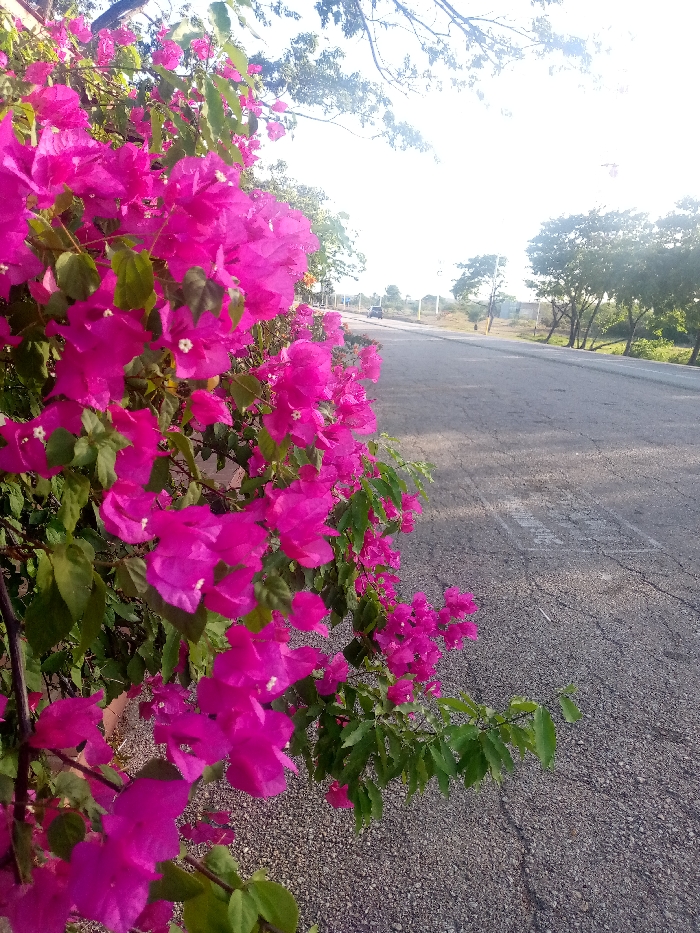The scene depicts an outdoor environment in Las Guevaras, Venezuela. The foreground and left midground feature a dense growth of bougainvillea, characterized by numerous fuchsia to magenta-colored bracts surrounding small white florets, interspersed with green ovate leaves. The foliage extends outward towards the right. An asphalt road, appearing dark grey with visible cracks and texture variations, occupies the midground and recedes into the background on the right side of the image. Faint, worn white markings are faintly discernible on the road surface. Along the right edge of the road in the background, a line of green-leafed trees is visible. In the distant background on the road, a small, light-colored vehicle is present. The sky above is significantly bright, appearing almost white, with sparse, dark tree branches silhouetted against it in the upper left quadrant. No individuals or specific actions are observed within the frame.