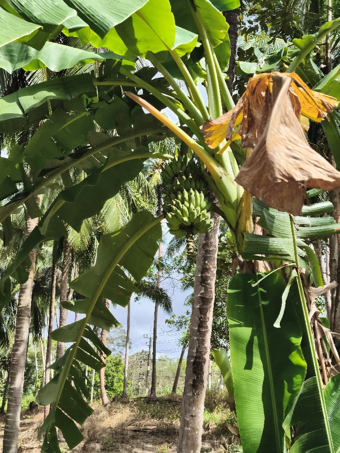 A banana tree is laden with a bunch of green bananas. Lush green leaves surround the fruit, while a large, dry, brown leaf droops nearby. The trunk of the tree is visible, displaying its natural texture. Other trees, possibly palm trees, rise in the background. A glimpse of a fence and some utility poles can be seen in the distance. The scene is bathed in natural sunlight.
