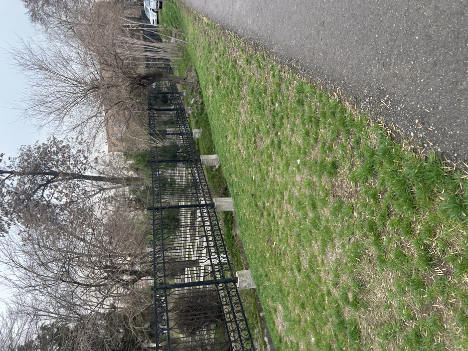 A narrow asphalt path borders a grassy area delineated by a decorative black metal fence. Beyond the fence, glimpses of headstones suggest a cemetery. Leafless trees stand near the fence, hinting at a season of dormancy. A white vehicle is visible further along the path. The scene conveys a sense of tranquility and somber reflection.