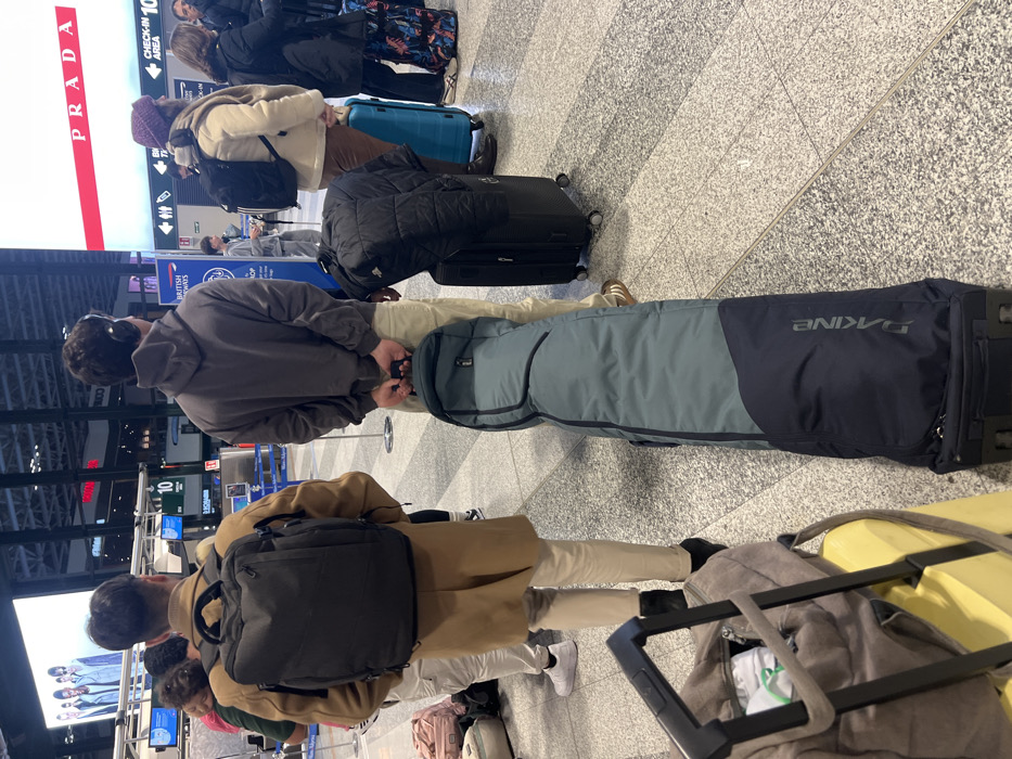 People stand in line at an airport check-in area. Luggage, including a Dakine bag, is arranged between them. A Prada store sign is visible above the crowd. The scene is illuminated by indoor lighting.