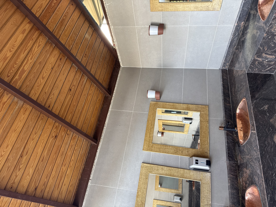 The image displays an unoccupied indoor washroom facility in Majjate, Morocco. The room features light gray tiled walls and a high, angled ceiling constructed from horizontal light brown wooden planks supported by darker brown metal beams. An opening along the top right wall provides ambient light. Two rectangular mirrors with textured gold-colored frames are mounted on the left wall, positioned above a dark, mottled granite countertop. Two oval-shaped, copper-colored washbasins are integrated into the countertop; the fully visible right basin is fitted with a black faucet accented with copper. A silver-colored automatic soap dispenser is mounted on the wall between the two visible mirrors. Two wall-mounted sconce lights, each comprising a terracotta-colored base and a white cylindrical diffuser, are visible on the right wall, with one partially reflected in the right mirror.