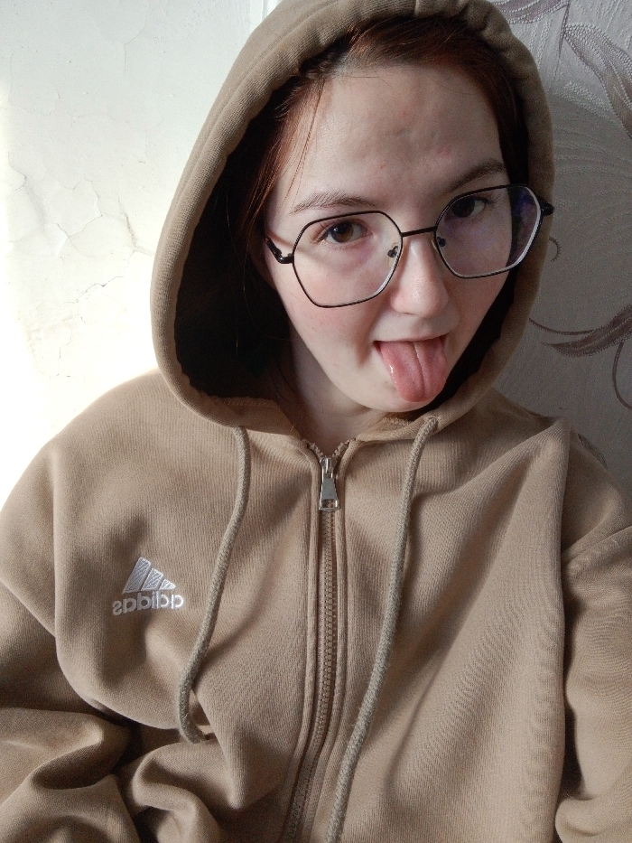 An indoor, chest-up portrait depicts a single individual, appearing female, positioned slightly off-center to the right. The individual is wearing a light brown or beige hooded sweatshirt, featuring a silver-toned metal zipper and matching drawstrings. An embroidered white logo, resembling a reversed Adidas "Badge of Sport" (visible as 'sabbidA'), is present on the left chest. The individual has visible light reddish-brown hair beneath the hood, wears dark-framed, hexagonal glasses, and is looking directly into the camera with their tongue extended. The background on the left consists of a light-colored wall with visible cracks and imperfections, while the right side features a light-toned wallpaper with a subtle, organic pattern. The scene is situated in the city of Kuyeda, Russia.
