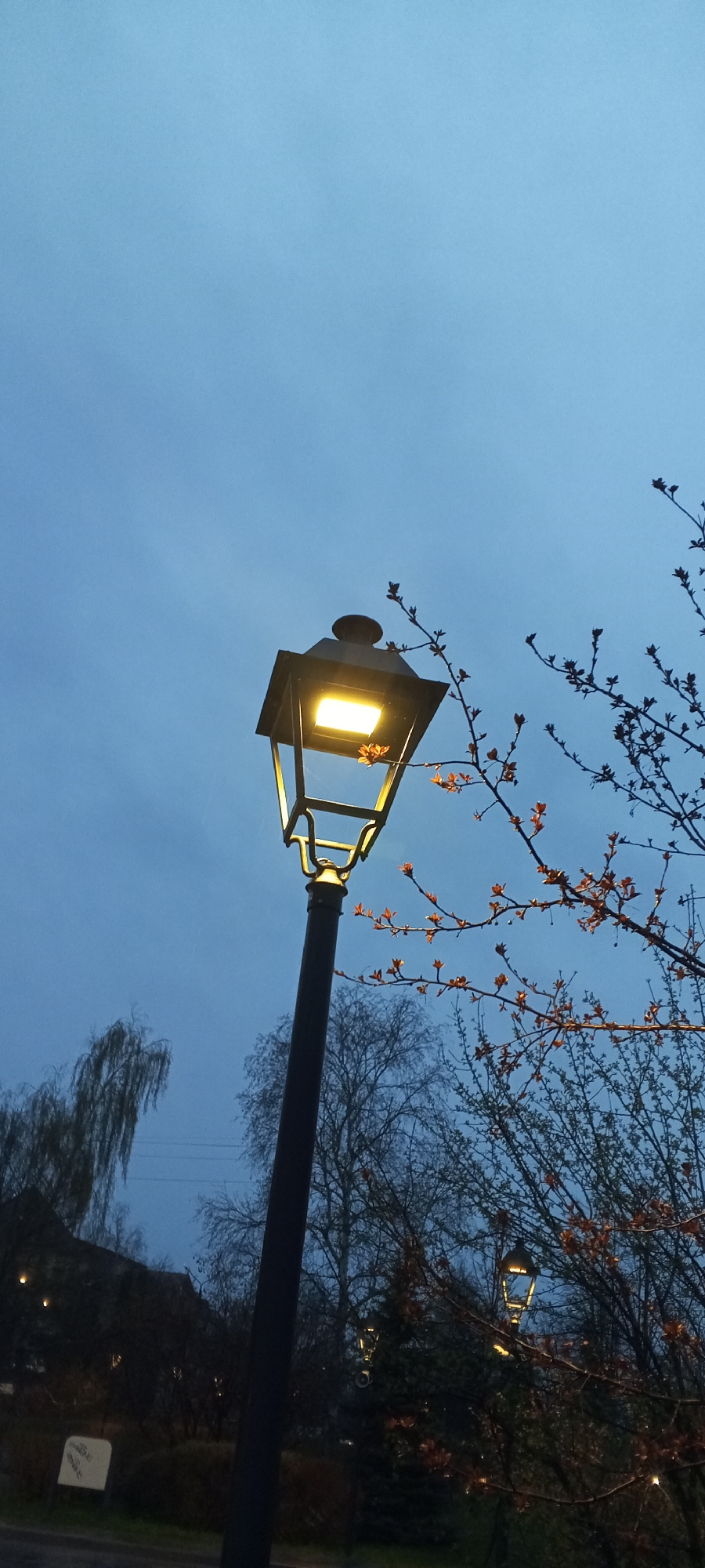 black lamppost with a lit light fixture on top, set against a blue dusk sky. The lamppost is situated near budding trees with reddish-brown leaves. Other trees and architectural elements are visible in the background, albeit dimly lit. A similar lamppost is visible between the trees on the right. The location is possibly in Dmitrov, Russia. No people are visible.