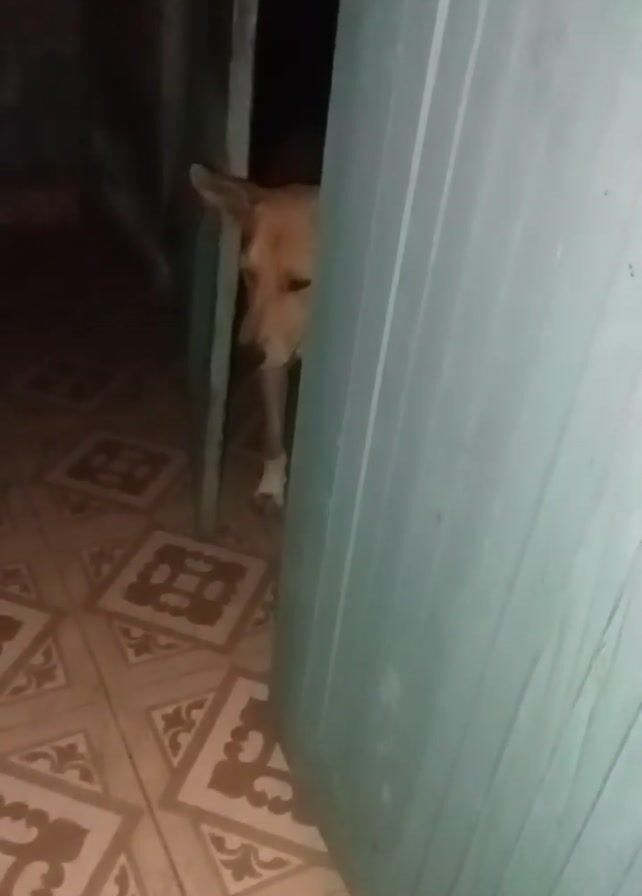 dog from a low-angle perspective, peering under a closed blue door. Only the dog's head and front paws are visible beneath the door. The floor is covered with tiles in a geometric pattern. The lighting appears dim.