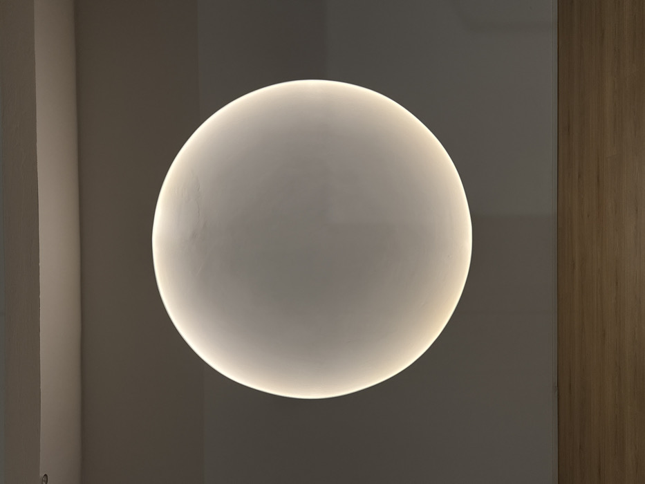 A circular light fixture dominates the image. The illumination is soft and diffused, with a bright perimeter fading towards the center. The fixture is mounted on a gray wall, visible surrounding it. To the left, a vertical white column or wall section extends, providing contrast. On the right, a wood-paneled structure is partially visible, adding a warm, textured element to the composition.