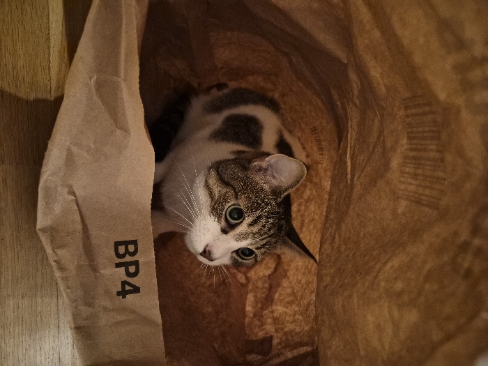 - "A domestic cat with tabby and white fur patterns is situated inside a crumpled, light brown kraft paper bag" by FM-lxB923, licensed under CC BY 4.0