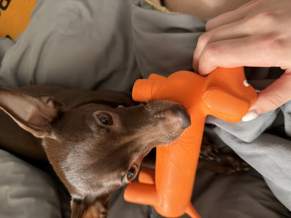 - "A close-up, high-angle indoor photograph captures a small, brown, short-haired dog and a human hand interacting with an orange toy" by FM-sCbJW2, licensed under CC BY 4.0