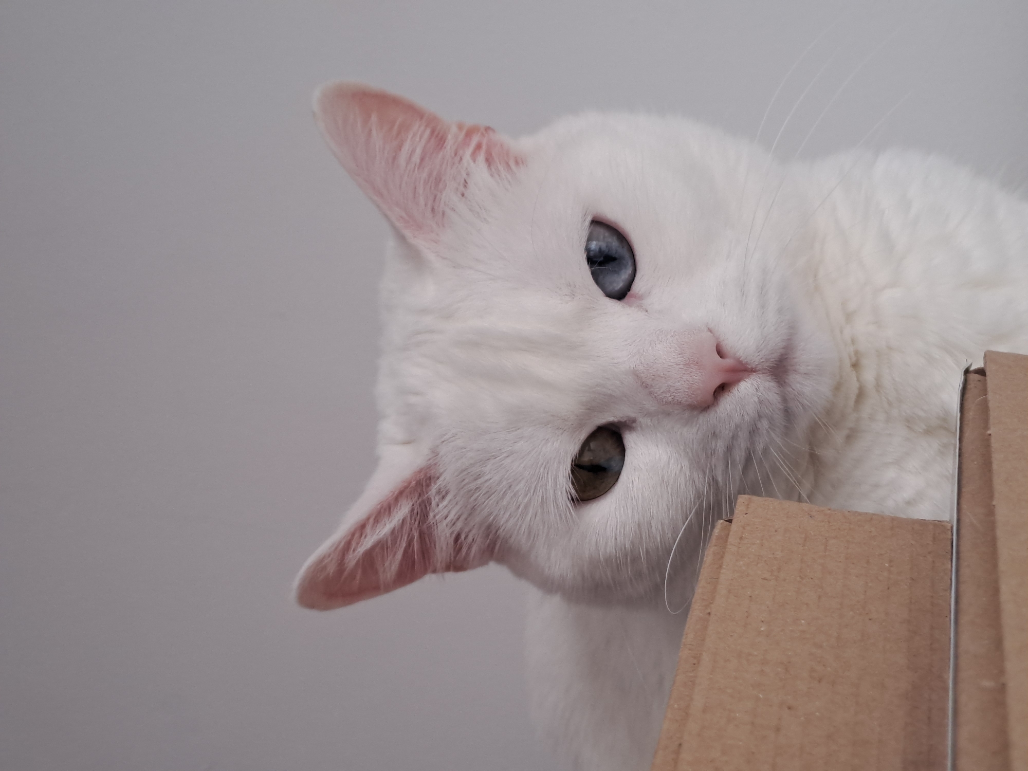 An indoor scene in Slivnitsa, Bulgaria, depicts a white domestic feline positioned with its head and upper torso visible. The animal's gaze is directed forward. It exhibits heterochromia; the right eye (viewer's left) is an amber/greenish-brown, and the left eye (viewer's right) is blue. Its nose is pink, and white whiskers extend from its muzzle. The lower-left foreground contains sections of light brown corrugated cardboard boxes, partially obscuring the feline's lower body. The background consists of an unadorned, plain light grey surface. No human subjects are present.
