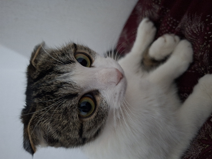 - "The image displays a domestic cat, identified by its characteristic folded ears as likely a Scottish Fold" by FM-OxQk33, licensed under CC BY 4.0