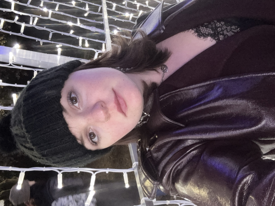 A young woman with light skin and brown eyes wears a black beanie with a pom-pom, a dark brown jacket, and a lacy black top. She has a nose ring and a silver chain necklace. The background features a grid of white lights. The photo is taken at a tilted angle, with the woman looking up towards the camera.