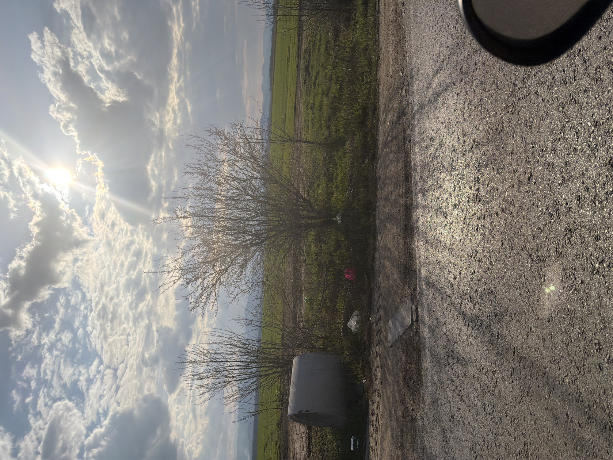 The image depicts an outdoor rural or semi-rural scene in Smirnenski, Bulgaria, captured from a low vantage point, likely from a vehicle based on the visible side mirror in the lower right. The scene is illuminated by the sun, partially obscured by an overcast sky with scattered cumulus and altocumulus clouds, casting long shadows indicative of late afternoon or early morning. The foreground consists of a dark asphalt road surface. Tree shadows extend diagonally across the road from the right. A section of a black-framed vehicle side mirror is visible in the lower right quadrant. Adjacent to the road, a dirt and sparse grass verge is present. In the midground, a large, cylindrical, grey concrete pipe section rests horizontally on the ground. To its right, a cluster of deciduous trees and shrubs, currently bare of leaves, grows. Scattered refuse is visible near the vegetation, including a white plastic bag and a distinct pink plastic object. The background features a vast, flat green field, suggesting agricultural land, extending towards a distant, hazy mountain range visible under the cloudy sky. No individuals are present in the frame.