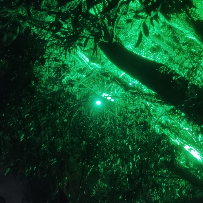 The image displays a nighttime scene within an unspecified park or green area in Hrodna, Belarus. The view is a low-angle perspective, looking upwards into the canopy of dense foliage. The entire environment is illuminated by artificial green light. A prominent, bright, circular green light source is visible slightly to the left of the image center, appearing to project light upwards and outwards. Additional diffuse green illumination is present throughout the dense network of leaves and branches. A large tree trunk occupies the upper right portion of the frame, extending diagonally downwards. The scene is devoid of any discernible individuals, specific man-made objects other than the light sources, or actions beyond the static illumination of the natural environment. The primary colors observed are various shades of green, with darker, unlit areas appearing as deep shadows.