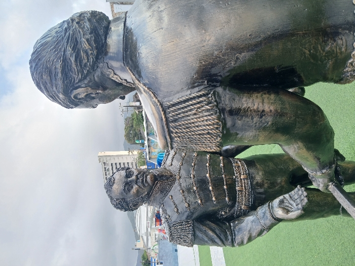 A bronze sculpture portrays two figures, likely historical or commemorative, against an urban backdrop. The upper figure, larger in scale, wears a formal coat. Below, the second figure is adorned in a decorated military-style jacket. They are on a green surface, possibly artificial turf. Buildings and a cloudy sky complete the background.