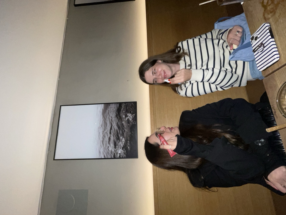 Two women sit at a wooden table indoors with a modern, minimalist background. One wears a black blazer and glasses, holding a red beauty product near her face. The other wears a striped sweater and holds a white and red stick, possibly lipstick. A framed picture of a stormy sea hangs on the gray wall behind them, along with a recessed light fixture. There's also a second, partial frame visible on the right side of the wall.