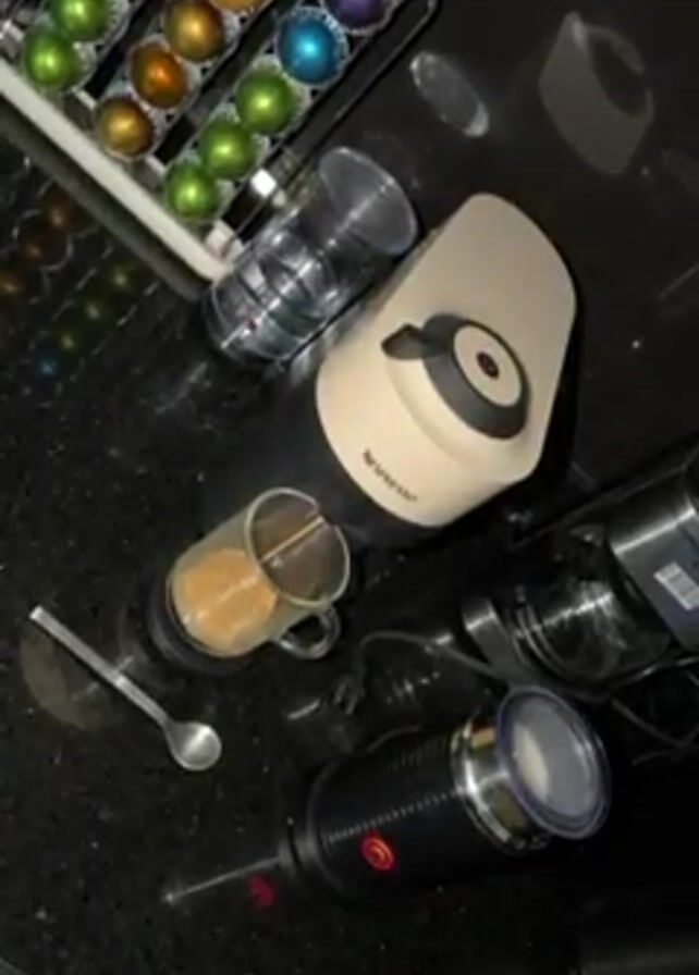On a black, speckled countertop sits a Nespresso coffee maker, with a rack of colorful coffee pods to the side. A glass of coffee with some contents already inside sits next to a small spoon. Nearby is a milk frother with foam inside. Two empty clear glasses and another appliance are also visible. The scene is well-lit.