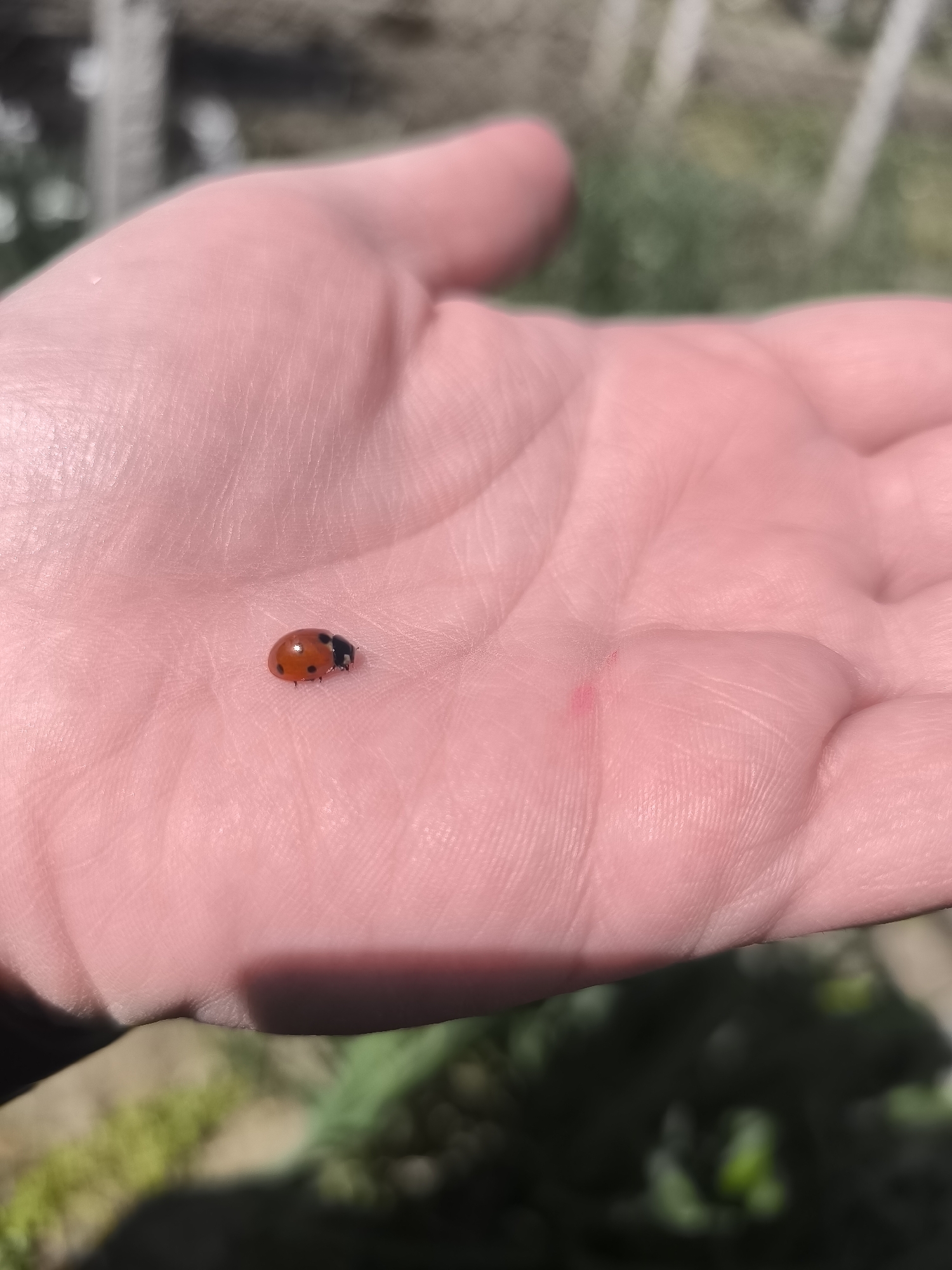 A close-up image shows a ladybug resting on the palm of a hand