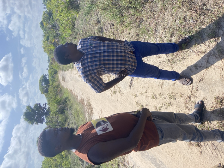 Two dark-skinned men stand on a sandy path flanked by greenery