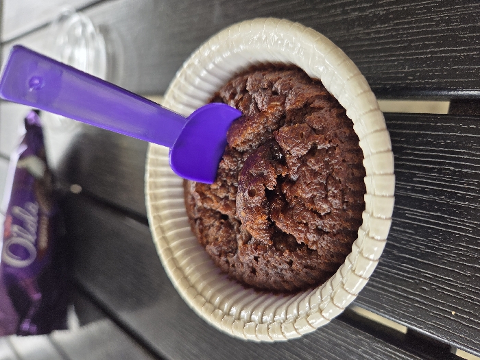 - "An eye-level, slightly angled shot depicts a brown, granular frozen dessert contained within a white, ribbed paper cup" by FM-8Olo43, licensed under CC BY 4.0