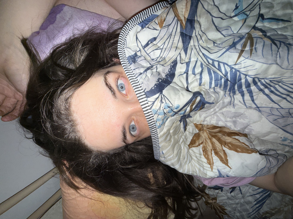 A person with striking blue eyes peeks out from under a patterned quilt. The quilt features large leaves in shades of blue and brown on an off-white background, with a black and white striped edge. Dark, wavy hair frames the face, with hints of gray visible near the forehead. The person appears to be lying down, as evidenced by the glimpse of a pillow and bed frame in the background. The perspective is slightly skewed, suggesting the photo was taken from above and at an angle.