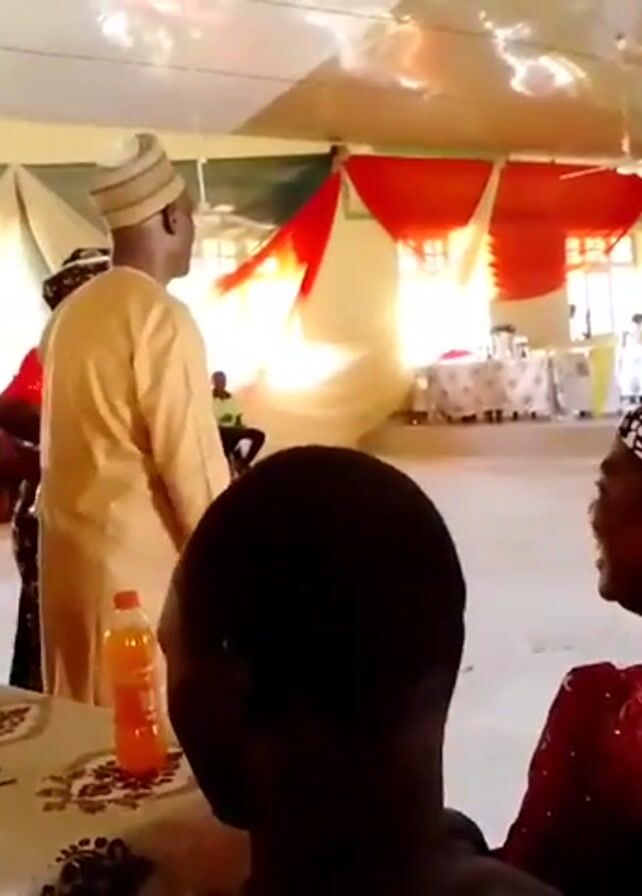 large room decorated for a celebration, likely a wedding reception or similar event. Tables with drinks are set up in the foreground, with people seated around them. The room is draped with red, white, and green fabric, and a raised stage area with floral decorations and lighting is visible in the background. A person on the stage appears to be speaking into a microphone. There are other people seated or standing throughout the room. The camera angle is from a seated position behind other guests.