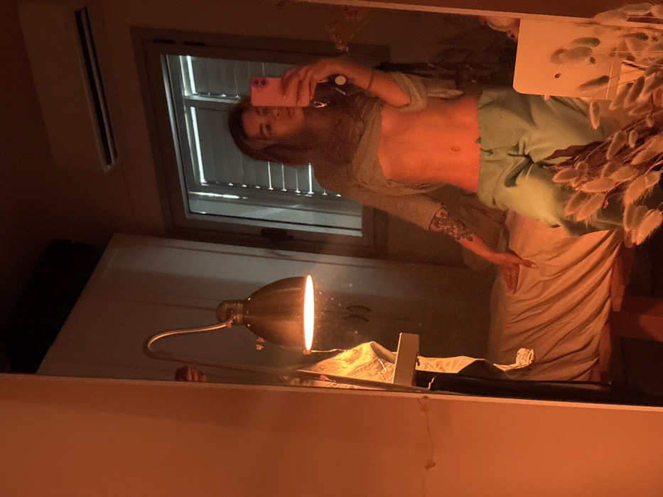 A person takes a mirror selfie, holding a pink phone. Visible in the mirror's reflection are a window with blinds, a desk lamp shining brightly, and floral decorations. The individual is wearing a cropped shirt and loose pants. Part of a white door frame is seen on the left. The overall scene is warmly lit.