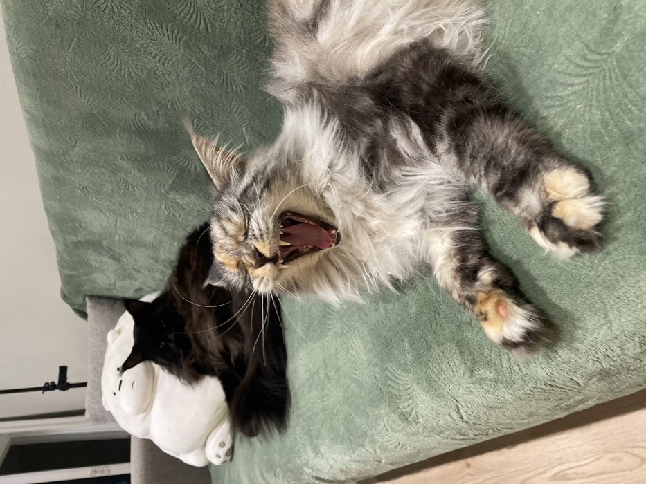 Two long-haired cats are observed indoors, positioned on a sage green couch with a textured, embossed pattern. The location is an unidentifiable residential setting within the city of Unknown, Unknown. In the foreground, a calico and silver cat lies partially on its back/side, actively yawning with its mouth wide open, exposing its teeth and a pink tongue. Its eyes are mostly closed during the yawn. Visible paws show light-colored fur with a distinct pink paw pad on the closest front paw. The cat's fur is a mix of white, grey, black, and orange/brown patches. In the mid-ground, a large, black, long-haired cat is resting upright or reclining on the same couch behind the yawning cat. Its dark fur obscures facial details due to lighting. Adjacent to the black cat is a white, plush, cartoon-style bear stuffed animal. The couch itself has a grey armrest or cushion on its left side. In the background, a light-colored wall or door frame is visible, along with a black vertical stand (possibly a light stand) to the left. The floor to the lower left consists of light-colored wooden planks. No human subjects are present in the frame.