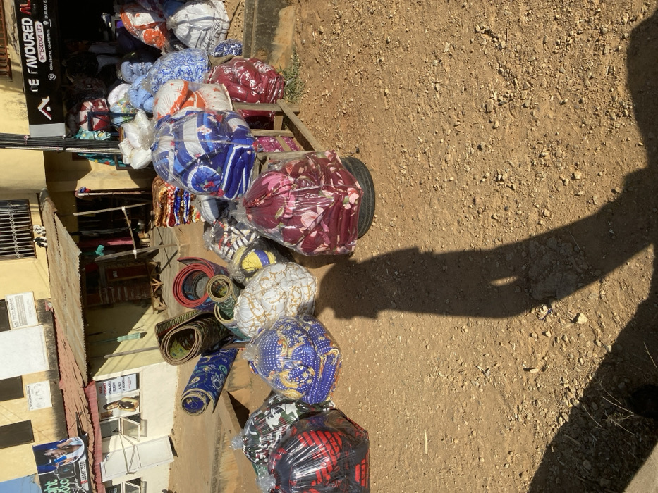 The image depicts an outdoor retail scene on a dirt thoroughfare in Bukuru, Nigeria