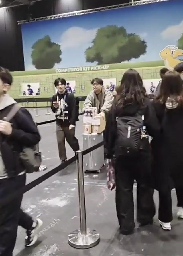 people passing through a large, enclosed convention space marked by metal stanchions and black tape. A large mural in the background depicts a cartoon landscape with trees and a Pokemon character. People walk past the ropes, some carrying boxes, bags, and suitcases. In the background, there is a counter where people are seated. A sign above reads "WELCOME TRAINERS!" and "Pokemon INTERNATIONAL". The floor is gray and appears somewhat worn. The lighting in the space is bright but somewhat uneven.