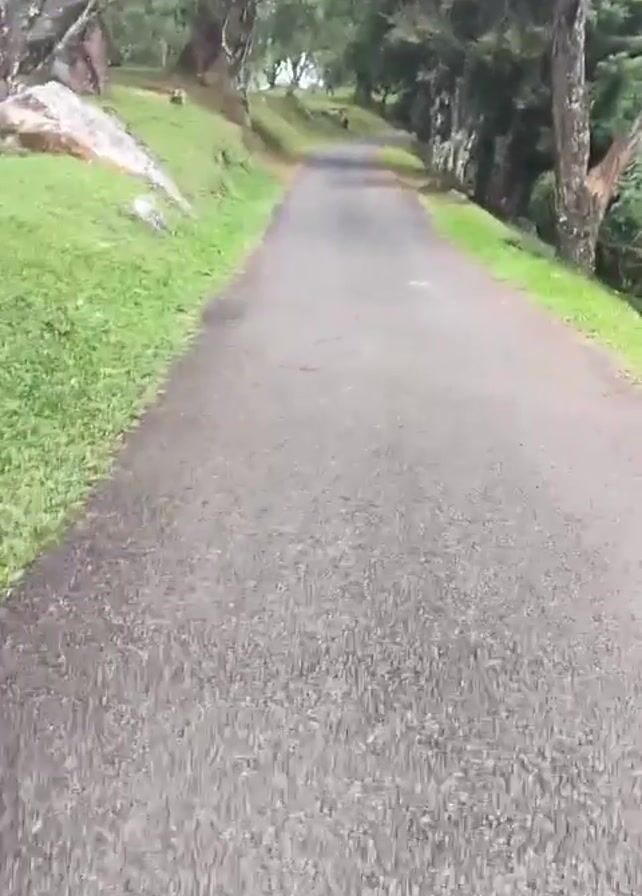 The video presents a point-of-view shot moving along an asphalt road winding through a forest or park
