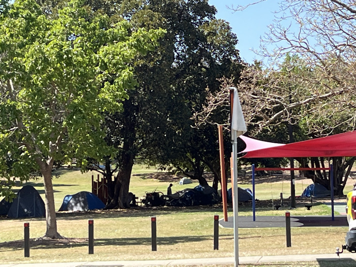 The image displays a daytime outdoor scene in a park setting within South Brisbane, Australia. The foreground features a paved area with a curb, bordered by four black vertical posts, each topped with a red reflector. A light-colored pole, from which a white, folded flag-like material hangs, stands vertically to the right of the posts. The mid-ground comprises a large, mown grass expanse dotted with numerous trees. From left to right: * A vibrant green, leafy tree stands prominently on the left. * At least five dome-style tents are visible: one dark blue tent is located on the far left under a tree, another blue-grey tent is positioned to its right, and a blue tent is visible near the playground on the right. A fourth, light-colored tent or tarp is in the distant background to the left of the playground structure. A fifth dark-colored tent is partially obscured behind a collection of dark tarps and bags under a large tree in the central mid-ground. * Near the center of the image, beneath a tree with dense dark foliage, a quantity of dark-colored objects, possibly tarps and bags, is piled next to what appears to be an open-frame cart or trolley. * One individual is present near these objects, silhouetted against the grass, in a crouched or bent-over posture with their back to the viewer. * On the right, a children's playground area is visible, featuring a swing set with at least two swings and a wooden climbing structure. Two large red shade sails extend over parts of the playground equipment. The background shows additional trees with varying levels of foliage, some appearing bare-branched against a clear blue sky in the upper right quadrant. The far right edge of the image shows a partial view of a white vehicle, possibly a utility vehicle, displaying yellow and red markings.