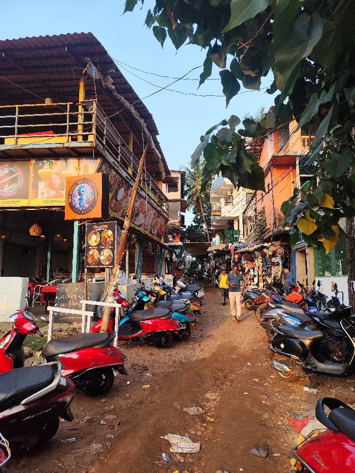 The image depicts a narrow, unpaved commercial street in Arambol, India, under clear, late afternoon lighting