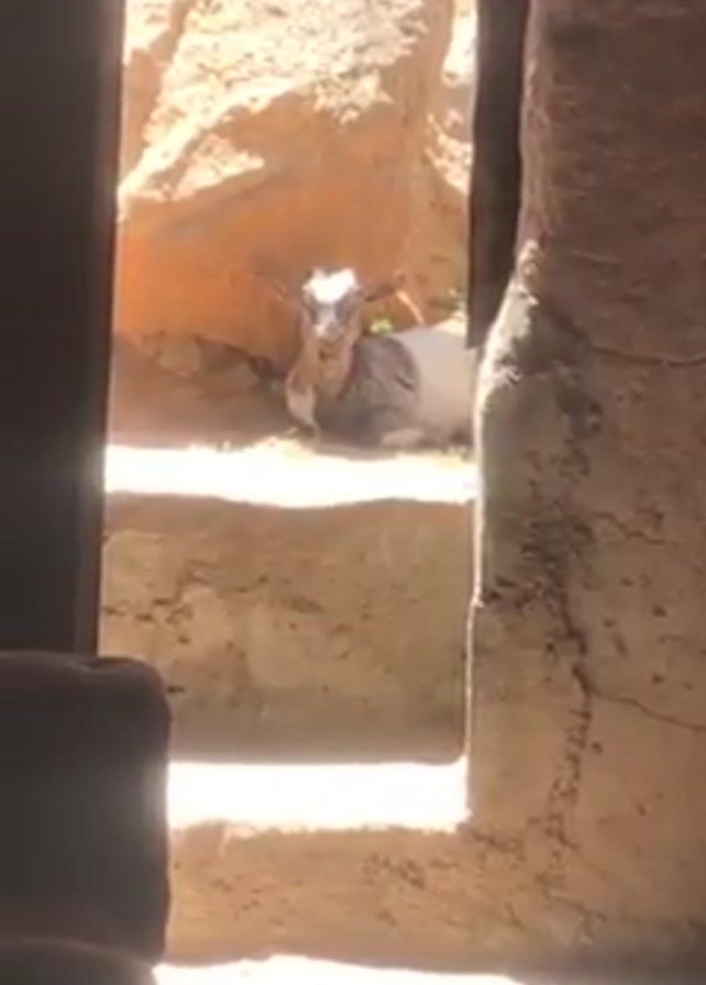 goat lying on a stone ledge outside a building. The goat is white with gray markings. It is lying down and looking towards the camera. Behind the goat is a large rock with a pink cloth draped over it. The building is made of stone and has a doorway leading to the outside. The view is from inside the building, looking out through the doorway.
