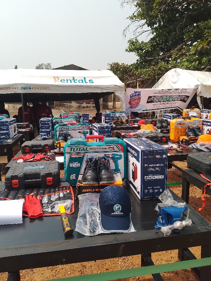 The image depicts an outdoor event taking place in Lokoja, Nigeria, under a bright, clear sky on reddish-brown earth. Numerous dark, flat tables are arranged, laden with various new tools, equipment, and safety gear. Prominently displayed are TOTAL brand power tools, including impact wrenches/drills in their original green and black cases and boxes, MAXMECH MMA 250 welding machines in packaging, and INGCO branded toolboxes. Safety equipment includes black "JUNGLE RIDER" safety boots, yellow hard hats, red and black work gloves, and blue baseball caps bearing the "Kogitech Industries Ltd." logo. Other visible items include a blue vise, a small yellow screwdriver, a roll-up hand tool kit, and white paper documents. In the background, two white canopies are erected. One canopy features the text "Rentals" in blue, along with phone numbers (08035497, 08033342487). Another canopy displays a banner featuring a man in a cap, with text indicating a "SKILL ACQUISITION" and "EMPOWERMENT PROGRAMME" for "KOGI YOUTH" in "LOKOJA." Several individuals, predominantly wearing red shirts, are visible under the canopies in the background, appearing to be attendees or organizers of the event. Sparse tree foliage is visible against the clear sky above the canopies.