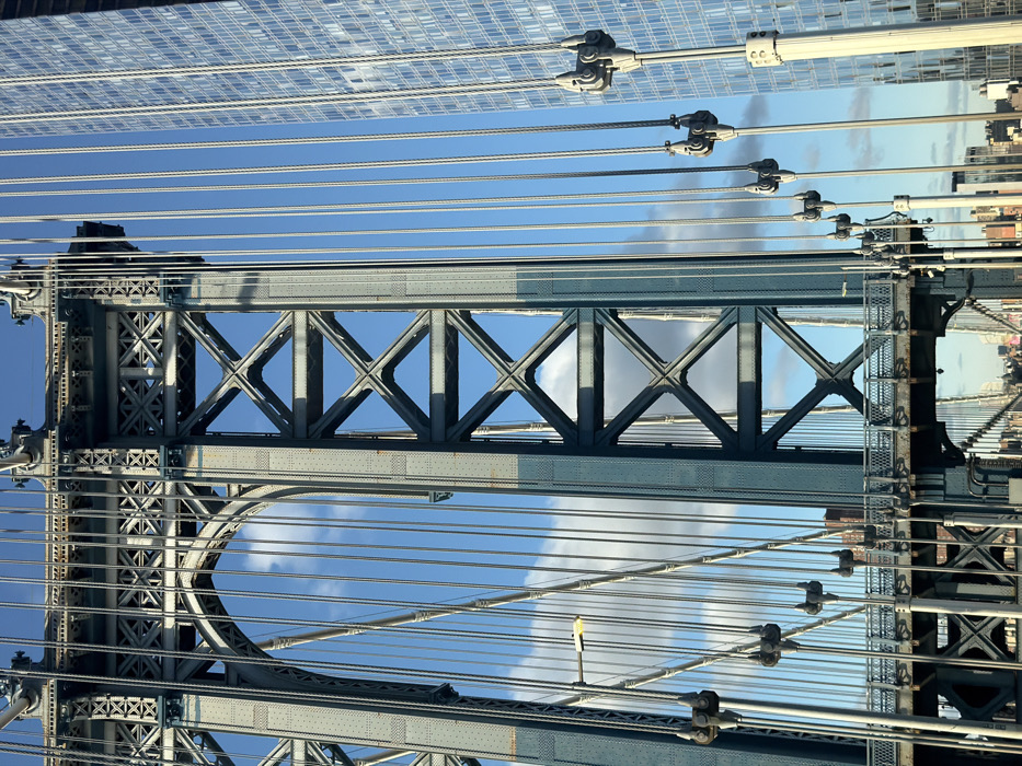 The image depicts a segment of the Manhattan Bridge from an unusual, rotated perspective