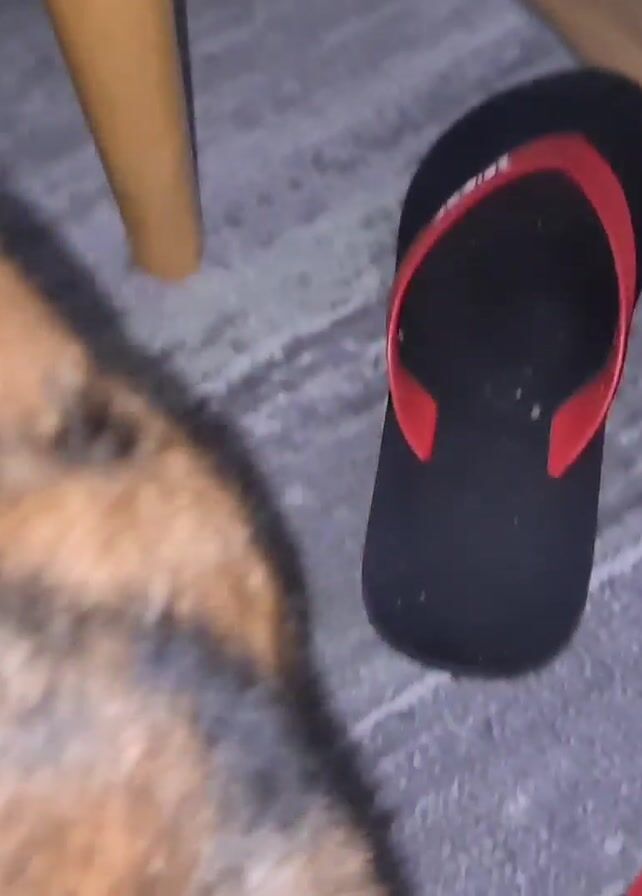 calico cat walking on a gray patterned carpet. A pair of black flip-flops with red straps are sitting on the carpet. In the background is a wooden bed frame and a white pillow.