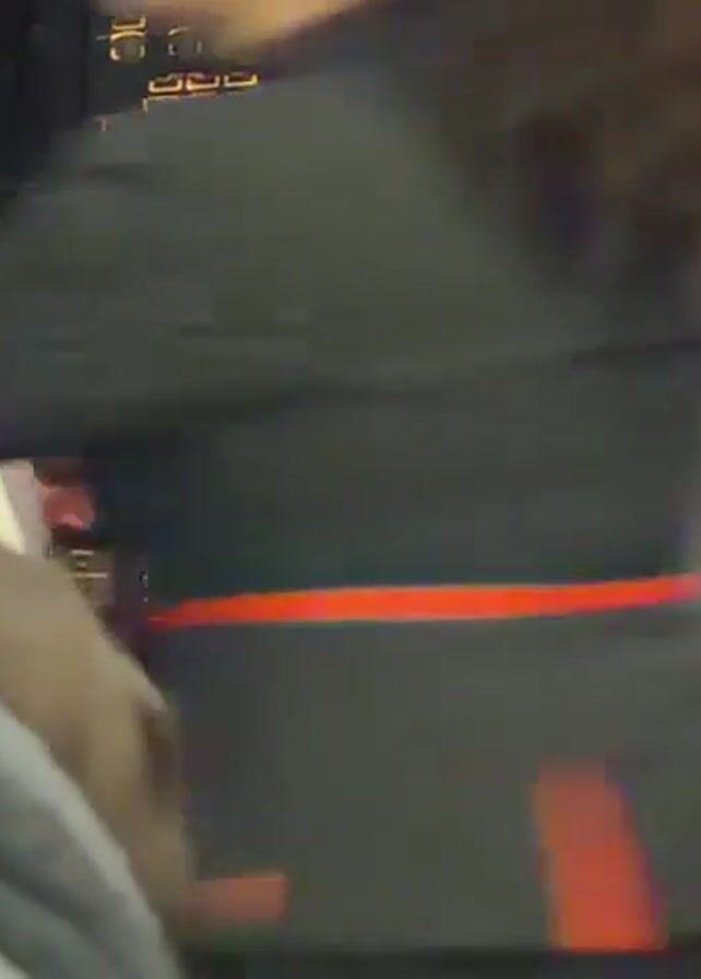 cockpit of an airplane, specifically the instrument panel with numerous illuminated buttons and screens. A person, mostly obscured, reaches into the frame and interacts with the dashboard, possibly adjusting controls. Outside the window, trees can be seen in the dark, suggesting it is nighttime or low-light conditions.