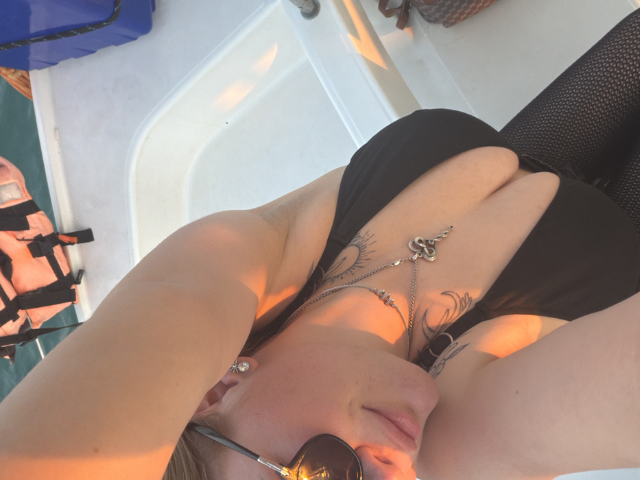 This image depicts an adult female subject on a white-decked boat in a body of water, located off the coast of Rawai, Thailand. The scene is illuminated by golden light consistent with either sunrise or sunset. The female subject, positioned from a high angle, occupies the majority of the frame, facing slightly left with her right arm raised, casting a shadow across her face. She wears dark sunglasses and a black bikini top, revealing cleavage. Black fishnet stockings are visible on her lower body. A circular, clear gemstone earring is present in her right ear. Two silver necklaces adorn her neck: a choker-style piece featuring a spiral design, and a longer chain suspending an ornate, key-shaped pendant resembling a coiled serpent. Tattoos are visible on her left upper chest/collarbone area, appearing as a sunburst or eye motif, and on her left shoulder, displaying a swirling abstract design. The boat's interior deck is white fiberglass, with an integrated seating or storage area on the right. In the background, blue-green water is visible, along with an orange life vest partially submerged or resting near the boat's edge. On the boat's deck to the right, a blue plastic container and a small, patterned brown and beige bag are present.