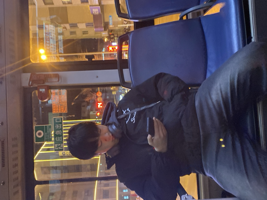 Inside a public transit vehicle in Linghe, China, a male individual is seated facing right, looking down at a black smartphone held in both hands