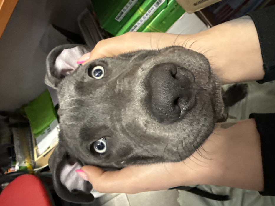 The image displays a close-up, front-facing view of a dog's head being cupped by two human hands. The dog is a blue-grey breed with short fur, wide-set, light blue eyes with black pupils, and a large, black, wet nose. Its floppy ears are partially visible, showing pink interiors. The human hands, with light skin tone and bright pink manicured fingernails on the thumbs, hold the dog's head on either side. Black long-sleeved garments are visible at the wrists of the person. The background, out of focus, suggests an indoor environment. On the left, a red chair back is discernible, alongside various dark and light objects. On the right, stacks of items with prominent green labels or covers are visible. This scene is located in the city of Varna, Bulgaria.