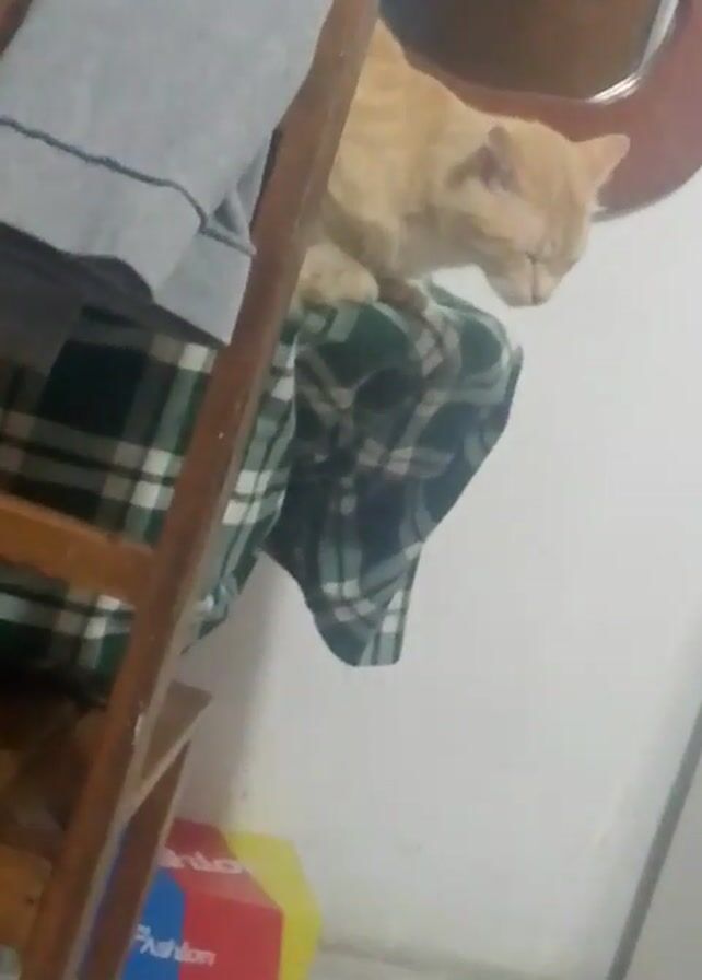 - "A tan cat sits atop a stack of clothes and plaid fabric on a wooden chair" by FM-BiXr82, licensed under CC BY 4.0