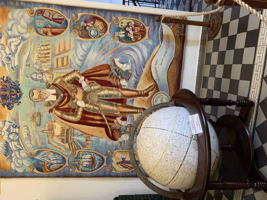 An interior hall within a historical building, likely Nesvizh Castle, in Nyasvizh, Belarus, is depicted. A large, vertically oriented tapestry dominates the central wall, featuring a central male figure dressed in gold armor and a red cape, holding a book. He has a beard and a white ruffled collar. Surrounding him are numerous vignettes portraying various scenes including ships, castles, a river, armored figures on horseback, religious figures, and a family portrait. Latin inscriptions and the year '2011' are visible at the bottom of the tapestry. In the immediate foreground, a large, antique-style terrestrial globe rests on a dark wooden stand, encircled by a metal meridian ring. The globe's surface is white with black outlines of continents and geographic labels. A white sign with red text, reading "PLEASE, DO NOT TOUCH" in both Belarusian and English, is attached to the globe's stand. The floor consists of black and white checkerboard tiles, bordered by a decorative white frieze. A section of a dark green tiled stove is visible on the far left, while a wooden stanchion with a rope barrier stands on the right, delineating the display area.