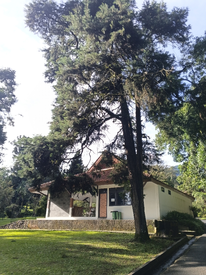 A single-story building with a reddish-brown tiled roof is situated on a grassy lawn